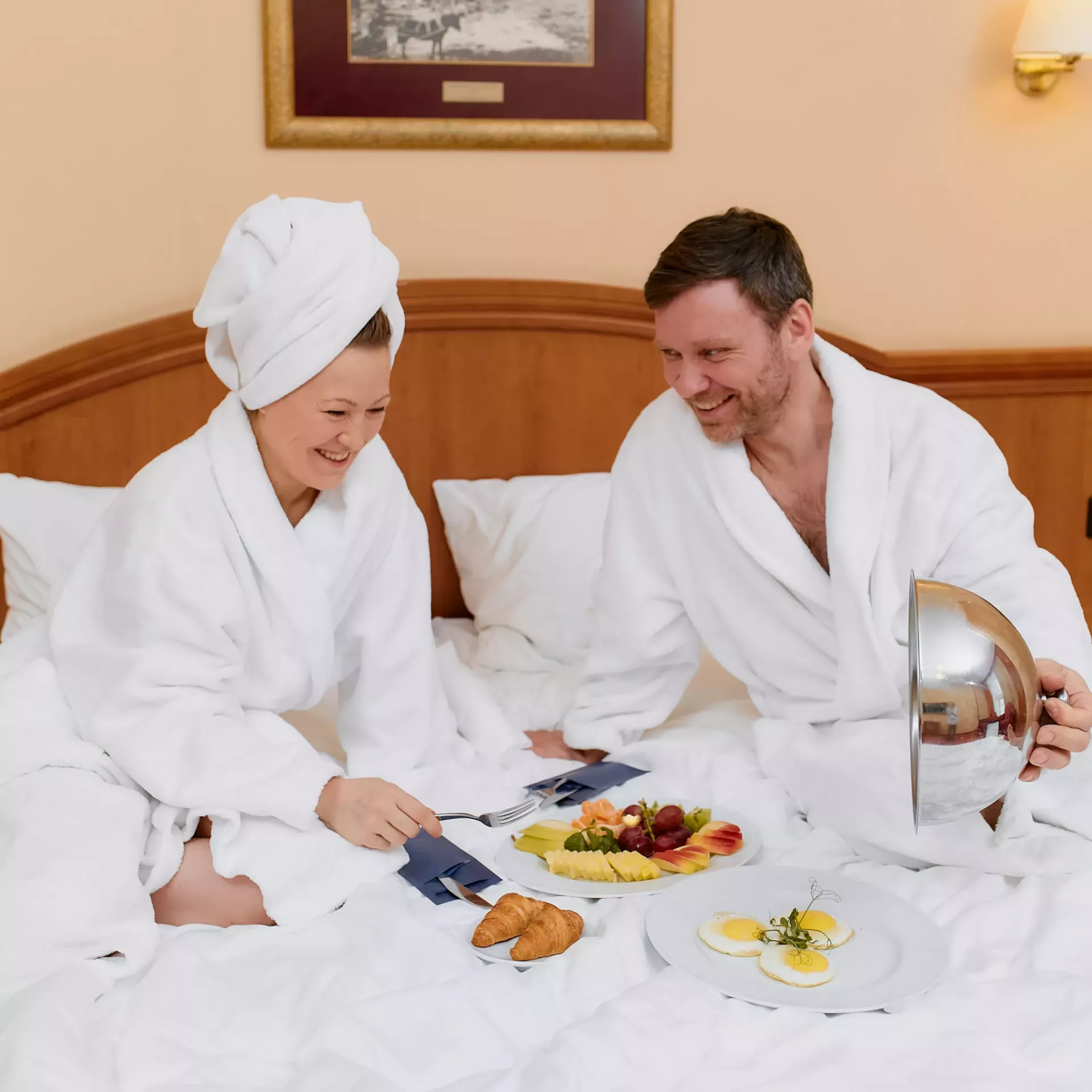 Просто закажите блюда и напитки из меню по внутреннему телефону 859 или через онлайн сервис по QR-коду, и мы доставим их в номер.